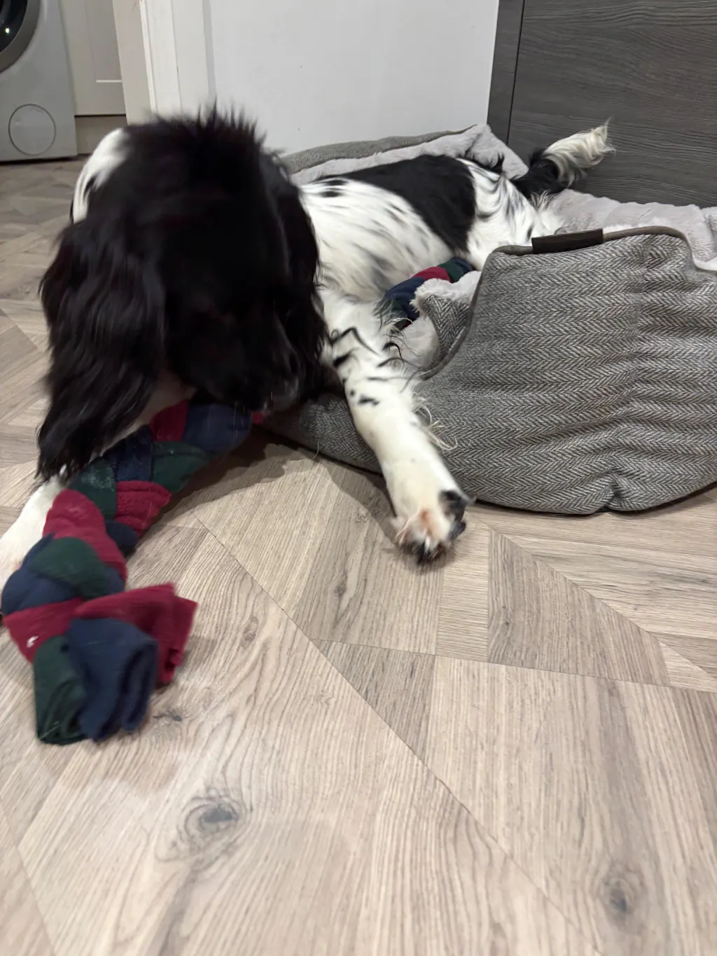 Gentle (non-spin) machine wash at 30 degrees using dog-safe detergent. Air dry.